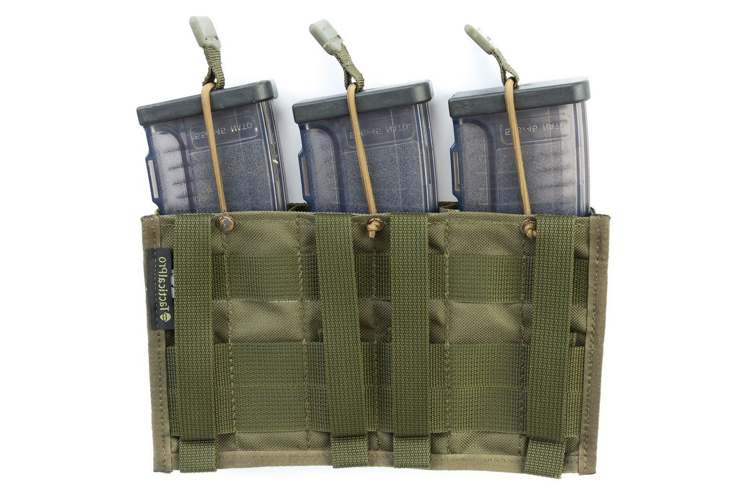 Q-Tasche für 3 Magazine mit 30 Schuss für das Sturmgewehr CZ 805 BREN. Das Magazin wird mit einem runden Gummiband in der Tasche gesichert und verfügt über einen Gummigriff, der auch mit Handschuhen einen einfachen Griff ermöglicht. Auf der Vorderseite der Tasche ist außerdem ein MOLLE-Gurtband zum Anbringen weiterer Taschen aufgenäht. In dieser Tasche können auch Magazine der SA vz.58, AK-47 oder AK-74 in den Kalibern 7,62x39mm und 5,45x39mm untergebracht werden.