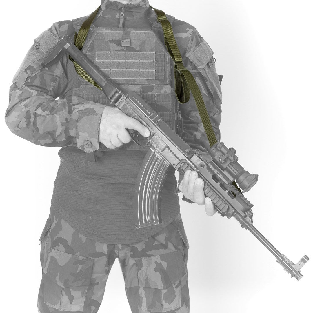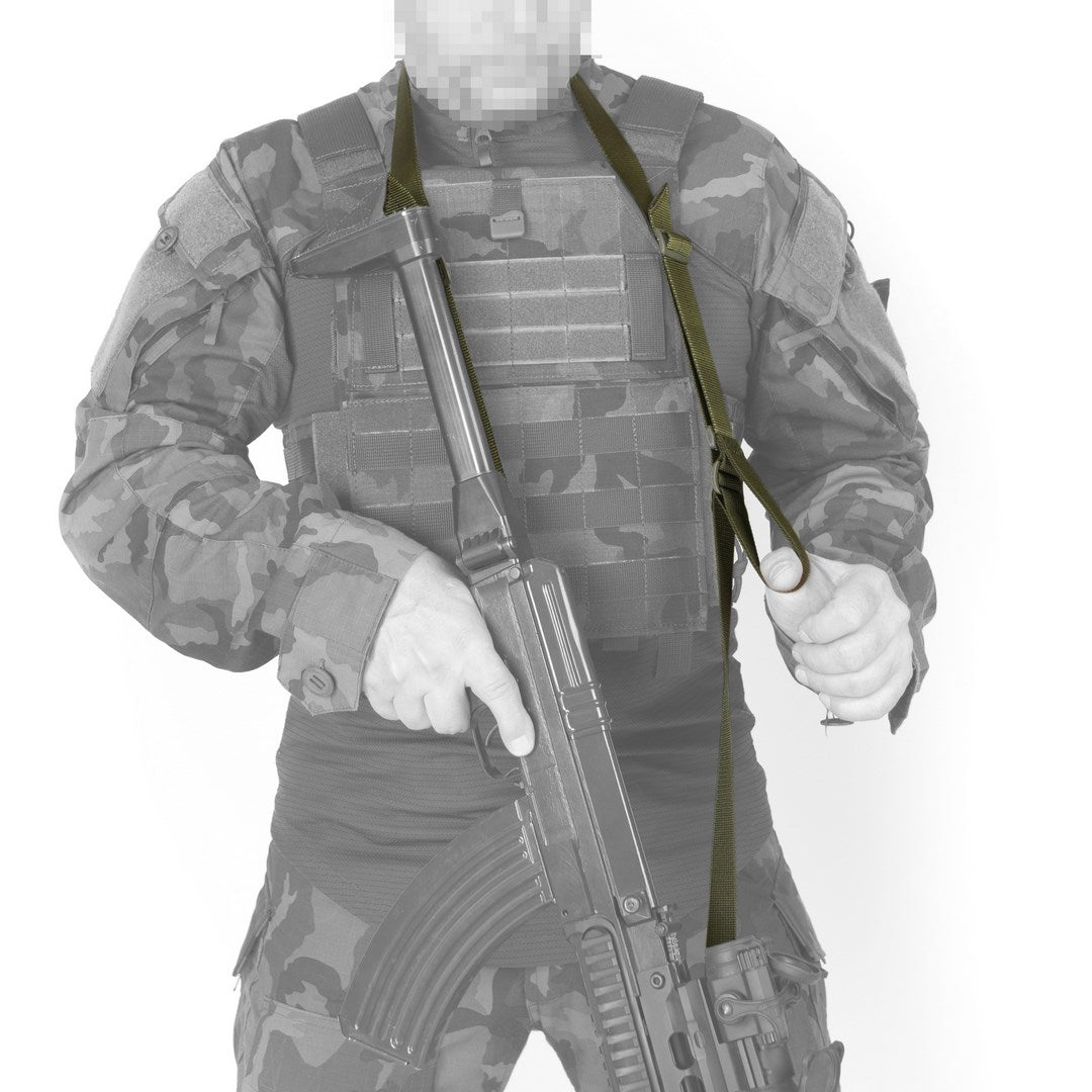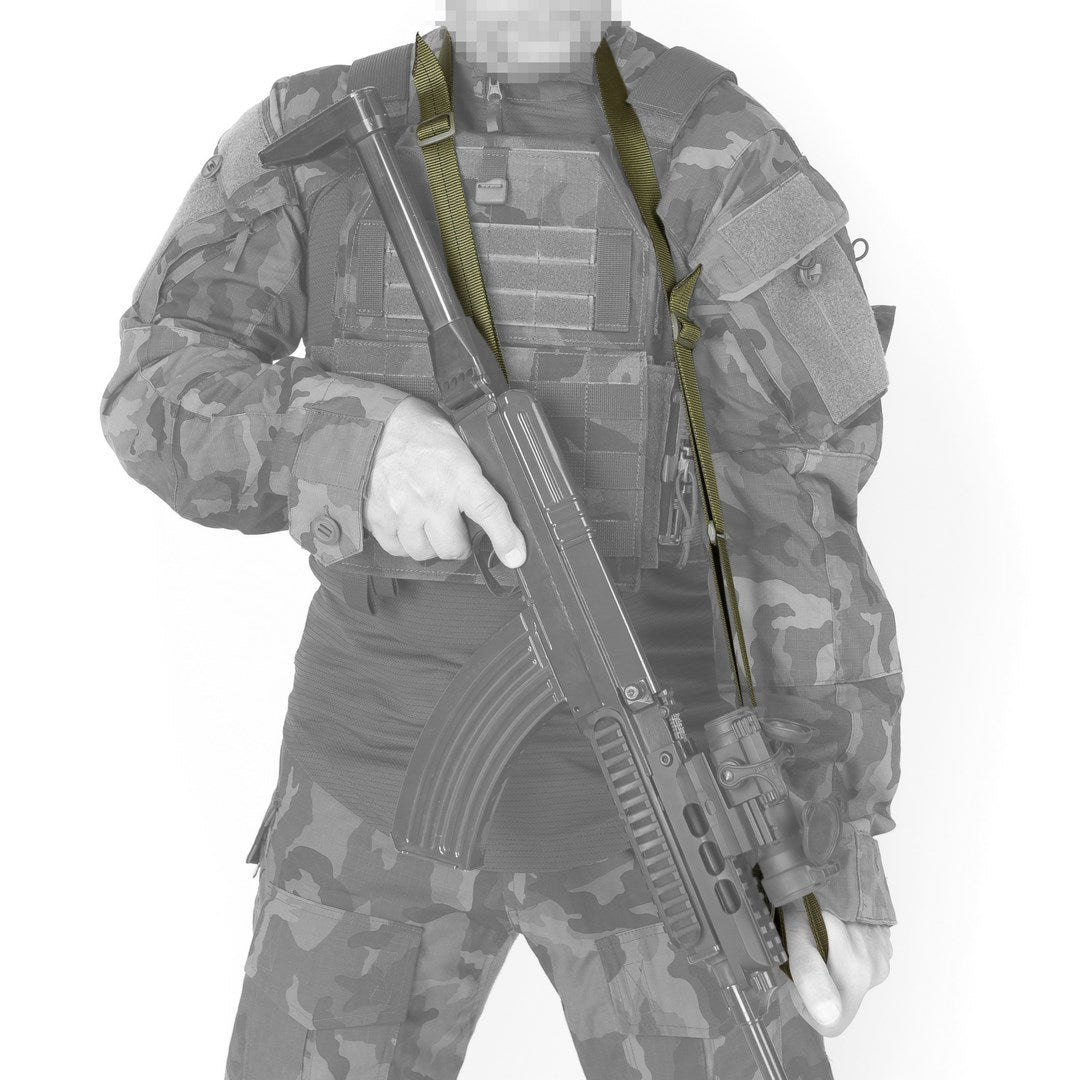 Taktischer 2-Punkt-Tragegurt für Langwaffen. Die Länge des Gurtes lässt sich bequem mit einer Hand verstellen. Es besteht aus hochfestem Gurtband, das glatt genug ist, um am bloßen Hals getragen zu werden und beim Wechsel auf eine Kurzwaffe oder auf dem Rücken nicht auf der Haut kratzt. Die Befestigung des taktischen 2-Punkt-Riemens erfolgt an der Waffe, indem das Ende des Riemens durchgefädelt und mit einer Kunststofföse gesichert wird.