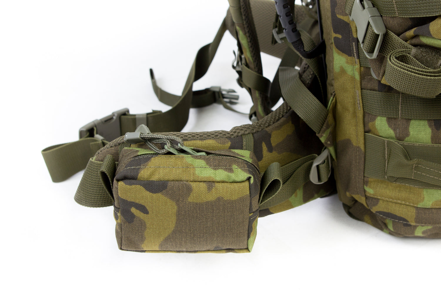 Die Befestigung der Tasche erfolgt über auf der Rückseite angenähte Riemen, die für die Befestigung am MOLLE-Gurt geeignet sind.