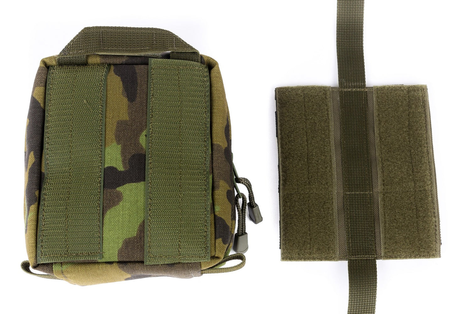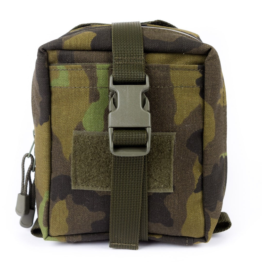 Lékárnička se upevňuje pomocí popruhů, které jsou našity na zadní straně a jsou přizpůsobeny k upnutí na MOLLE i UV vazbu.